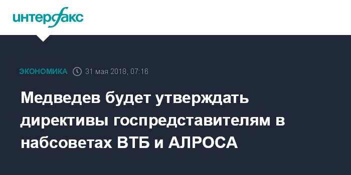 Москва. 31 мая. INTERFAX.RU - Премьер-министр Дмитрий Медведев будет утверждать директивы государственным представителям в набсоветах ВТБ и "АЛРОСА", следует из распоряжения правительства, о подписании которого сообщила пресс-служба кабмина.