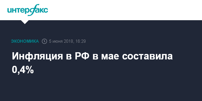 Москва. 5 июня. INTERFAX.RU - Инфляция в РФ в мае 2018 года осталась на уровне апреля и составила 0,4%, после 0,3% в марте, 0,2% в феврале и 0,3% в январе 2018 года, сообщил во вторник Росстат.