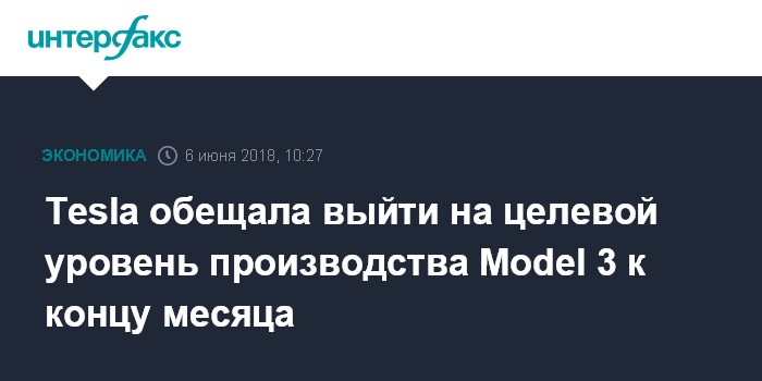 Москва. 6 июня. INTERFAX.RU - Американский производитель электромобилей Tesla Inc, скорее всего, выйдет на целевой показатель производства машин Model 3 в 5 тысяч в неделю к концу июня, заявил основатель и гендиректор компании Илон Маск на годовом собрании акционеров.