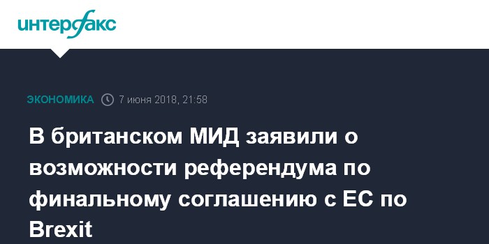 Москва. 7 июня. INTERFAX.RU - В Великобритании может пройти референдум, в ходе которого подданные выскажутся о финальном соглашении между Лондоном и Европейским союзом по выходу королевства из состава объединения (Brexit), заявил в четверг британский госминистр по делам Европы и Америки Алан Дункан.