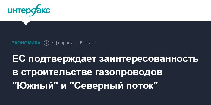 Москва. 6 февраля. INTERFAX.RU - Евросоюз подтвердил свою заинтересованность в осуществлении проектов "Южный поток" и "Северный поток", заявил премьер-министр РФ Владимир Путин.