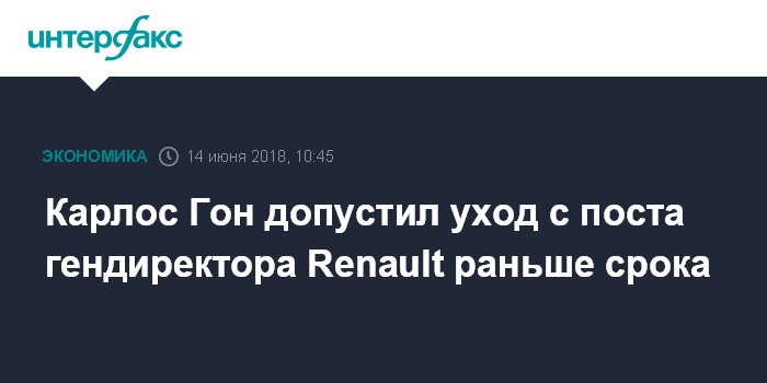 Москва. 14 июня. INTERFAX.RU - Генеральный директор французской автомобилестроительной компании Renault SA Карлос Гон, скорее всего, покинет этот пост раньше 2022 года, когда закончится его подписанный в феврале контракт с компанией, заявил он в интервью Financial Times.