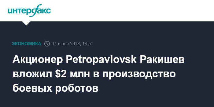 Москва. 14 июня. INTERFAX.RU - Кенес Ракишев, крупнейший акционер золотодобывающей компании Petropavlovsk, вложил $2 млн в производство боевых роботов, сообщил "Интерфаксу" представитель бизнесмена.