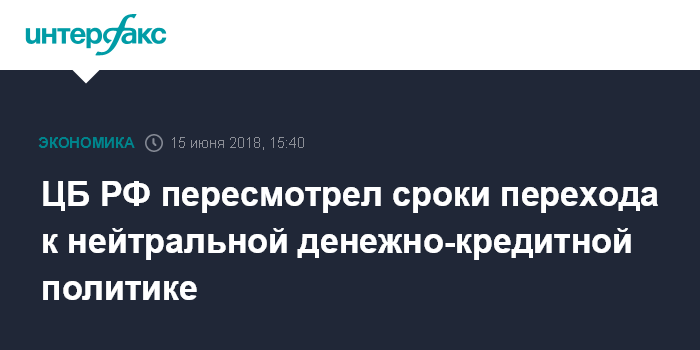 Москва. 15 июня. INTERFAX.RU - ЦБ РФ пересмотрел сроки перехода к нейтральной денежно-кредитной политике (ДКП): вероятнее всего, он состоится в 2019 году, заявила глава Банка России Эльвира Набиуллина на пресс-конференции по итогам совета директоров ЦБ.