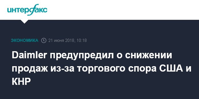 Москва. 21 июня. INTERFAX.RU - Германский автомобилестроительный концерн Daimler AG стал жертвой обострившегося торгового спора между США и КНР: он предупредил о потенциальном снижении продаж в 2018 году в результате планируемого Китаем введения дополнительных пошлин на американские автомобили.