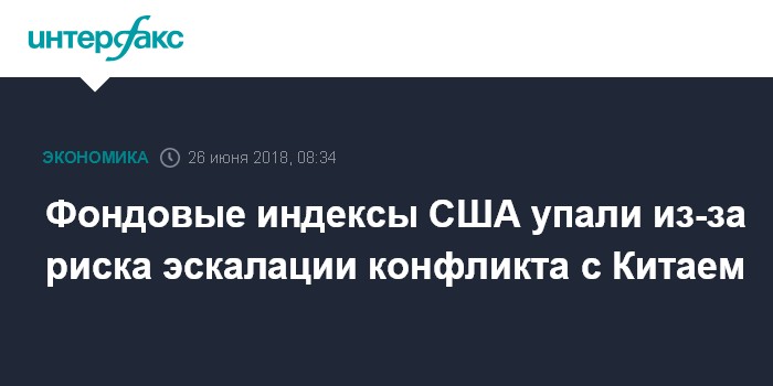 Москва. 26 июня. INTERFAX.RU - Американские фондовые индексы завершили торги в понедельник резким снижением на фоне падения цен на нефть марки Brent и опасениях нового витка напряженности в отношениях между США и Китаем.