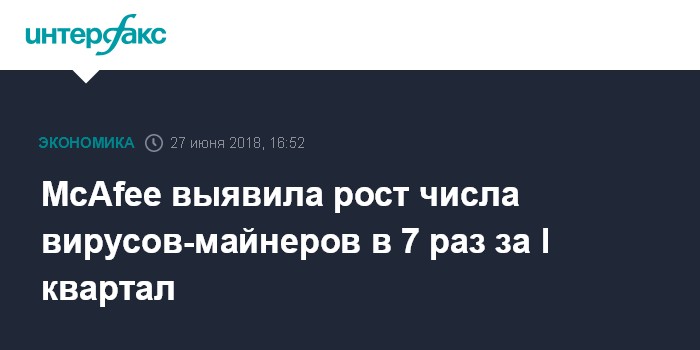 Москва. 27 июня. INTERFAX.RU - В январе-марте 2018 года было зафиксировано 2,9 млн разновидностей вирусов, заражающих компьютер и скрытно использующих его мощности для майнинга криптовалют, говорится в исследовании компании McAfee.