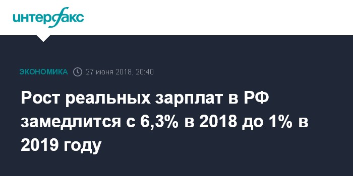 Москва. 27 июня. INTERFAX.RU - Минэкономразвития РФ ожидает замедления роста реальных зарплат в РФ с 6,3% в 2018 году до 1% в 2019 году, сообщил журналистам источник в финансово-экономическом блоке правительства.