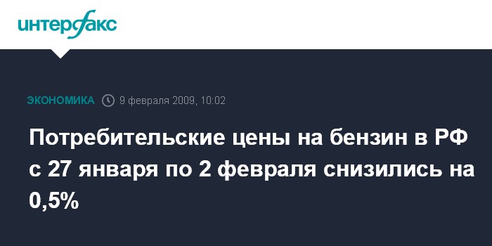 Москва. 9 февраля. INTERFAX.RU - Потребительские цены на автомобильный бензин в среднем по России с 27 января по 2 февраля снизились на 0,5%, сообщила в понедельник Федеральная служба государственной статистики РФ (Росстат).