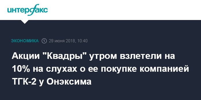 Москва. 29 июня. INTERFAX.RU - Акции ПАО "Квадра" утром в пятницу взлетели на 10% на слухах о ее возможной покупке компанией "ТГК-2" у группы "Онэксим".