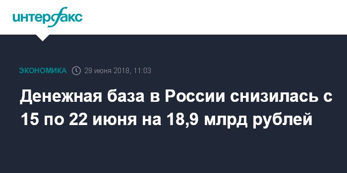 На 15 июня денежная база в России равнялась 10182,2 млрд рублей. Таким образом, за период она снизилась на 0,19%, или на 18,9 млрд рублей.