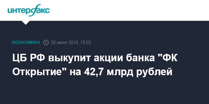 ЦБ РФ выкупит акции банка "ФК Открытие" на 42,7 млрд рублей