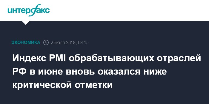 Москва. 2 июля. INTERFAX.RU - Индекс PMI обрабатывающих отраслей РФ в июне 2018 года снизился до 49,5 пункта с 49,8 пункта в мае, оказавшись ниже критической отметки второй раз за 22 месяца, согласно исследованию IHS Markit.