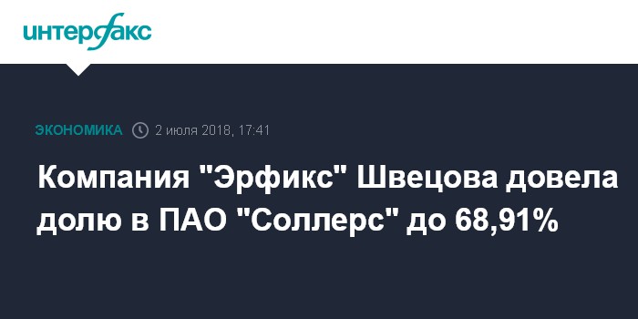 Москва. 2 июля. INTERFAX.RU - Доля ООО "Эрфикс" в уставном капитале ПАО "Соллерс" составляет 68,91%, следует из списка аффилированных лиц "Соллерса".