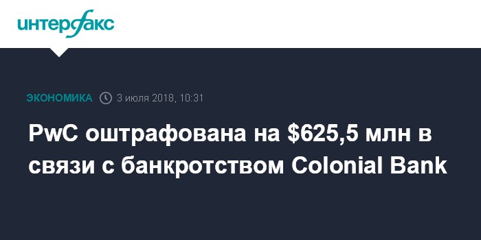 Москва. 3 июля. INTERFAX.RU - Аудиторская компания PwC обязана выплатить компенсацию в размере $625,5 млн в связи с банкротством в 2009 году Colonial Bank из штата Алабама, говорится в постановлении окружного суда США.