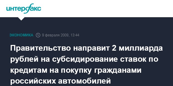 Москва. 9 февраля. INTERFAX.RU - Правительство предоставит из федерального бюджета 2 млрд рублей на субсидирование банкам процентных ставок по кредитам российским гражданами на приобретение российских автомобилей, сказал премьер-министр РФ Владимир Путин в ходе заседания президиума правительства РФ в понедельник.