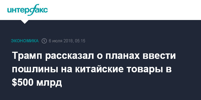 Москва. 6 июля. INTERFAX.RU - США могут в перспективе обложить повышенными таможенными пошлинами поставляемые в США китайские товары общей стоимостью, превышающей $500 млрд, заявил президент США Дональд Трамп.
