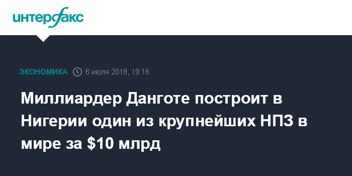 Москва. 6 июля. INTERFAX.RU - Самый богатый человек Африки, миллиардер Алико Данготе, планирует к 2020 году построить в Нигерии один из крупнейших НПЗ в мире, стоимость проекта оценивается в $10 млрд, сообщает агентство Bloomberg.