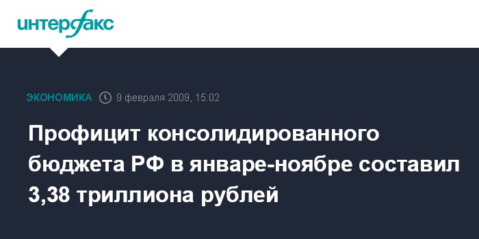 Москва. 9 февраля. INTERFAX.RU - Консолидированный бюджет России за январь-ноябрь 2008 года исполнен с профицитом 3 трлн 380 млрд рублей, тогда как по итогам аналогичного периода 2007 года он составил 2 трлн 523,1 млрд рублей. Эту информацию распространила в понедельник Федеральная служба государственной статистики РФ (Росстат).
