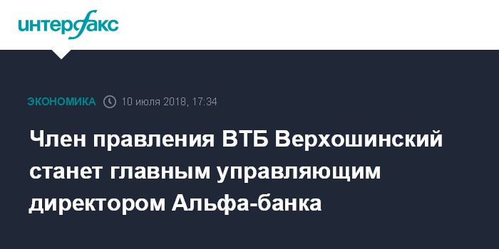 Москва. 10 июля. INTERFAX.RU - Член правления ВТБ Владимир Верхошинский с 1 августа станет главным управляющим директором Альфа-банка, говорится в пресс-релизе Альфа-банка.