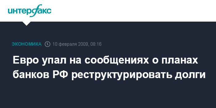 Москва. 10 февраля. INTERFAX.RU - Курс евро к доллару упал до $1,2873 с $1,3003 во вторник после сообщения японской газеты Nikkei о планах российских банков и компаний реструктурировать внешние долги на $400 млрд.