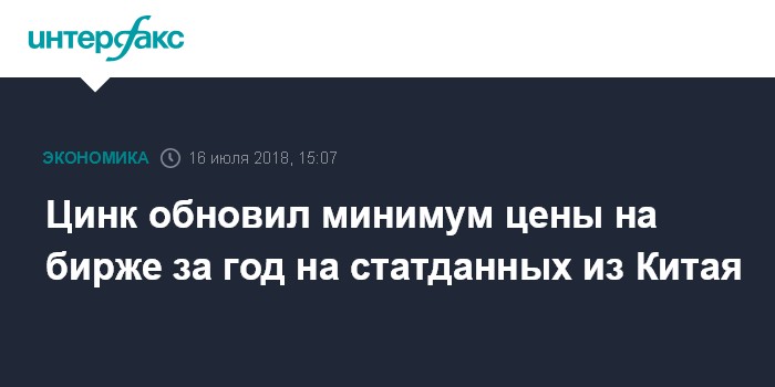 Москва. 16 июля. INTERFAX.RU - Стоимость цинка на Лондонской бирже упала до минимума за год на опасениях по поводу замедления темпов роста экономики Китая.