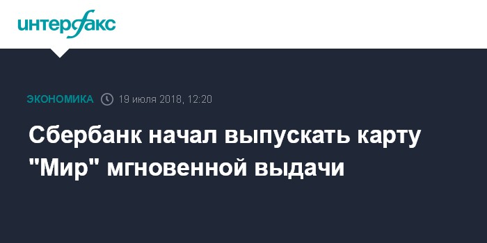 Москва. 19 июля. INTERFAX.RU - Сбербанк России начал эмитировать карту "Мир" мгновенной выдачи, говорится в пресс-релизе кредитной организации.