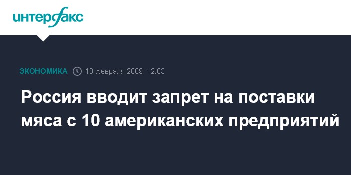 Москва. 10 февраля. INTERFAX.RU - Россия с 10 февраля запрещает поставки мяса с 10 предприятий США.