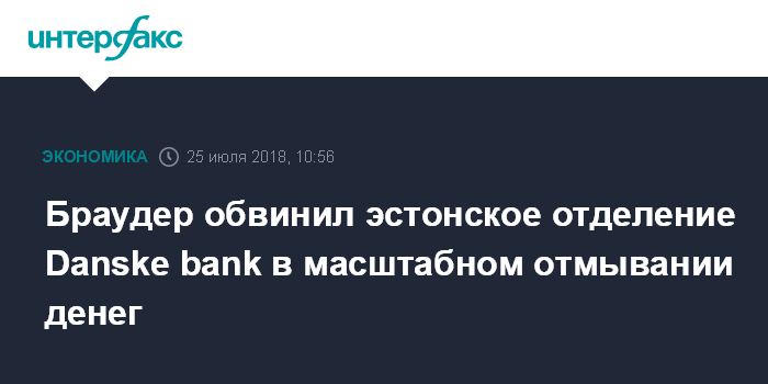 Москва. 25 июля. INTERFAX.RU - Обвиняемый в России в мошенничестве глава компании Hermitage Capital Уильям Браудер заявил о причастности 26 сотрудников эстонского отделения Danske bank к отмыванию миллиардов долларов, сообщили эстонские СМИ в среду.