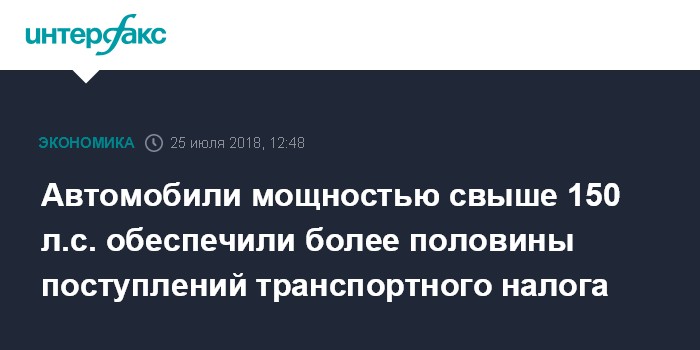 Москва. 25 июля. INTERFAX.RU - Автомобили мощностью свыше 150 л.с., доля которых в общем количестве налогооблагаемого парка машин составляет всего 13%, обеспечивают 55% поступлений транспортного налога, говорится в сообщении Федеральной налоговой службы (ФНС).