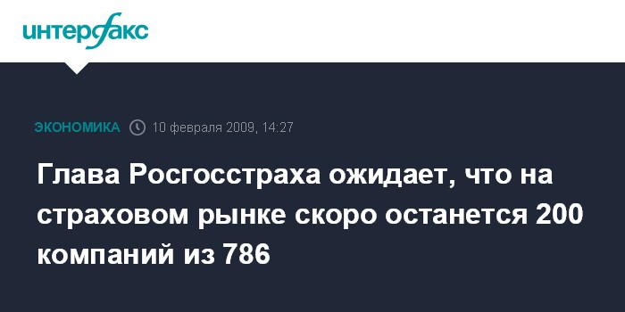 Москва. 10 февраля. INTERFAX.RU – Глава "Росгосстраха" Данил Хачатуров ожидает, что из 786 страховщиков РФ в ближайшее время на рынке останется около 200 компаний. Такой прогноз сокращения числа страховых компаний во время кризиса он высказал на встрече с журналистами во вторник.