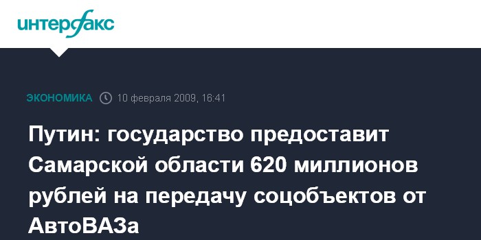 Москва. 10 февраля. INTERFAX.RU - Государство в 2009 г. предоставит Самарской области субсидию на 310 млн рублей и кредит аналогичного размера, профинансировав таким образом передачу социальных объектов "АвтоВАЗа" (РТС: AVAZ) городу Тольятти, заявил премьер-министр РФ Владимир Путин в ходе совещания с участием губернатора Самарской области Владимира Артякова, вице-премьеров Алексея Кудрина и Игоря Сечина и гендиректора "Ростехнологий" Сергея Чемезова.