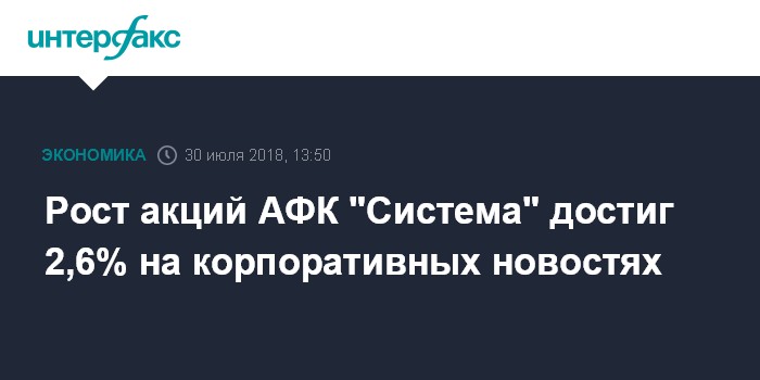 Москва. 30 июля. INTERFAX.RU - Рост акций АФК "Система" в ходе торгов на Московской бирже достиг 2,6% (до 9,09 рубля за штуку) на новостях о том, что компания подписала соглашение с банком "Открытие", предусматривающее кредит в размере 15 млрд рублей без обеспечения со сроком погашения в 2021 году.