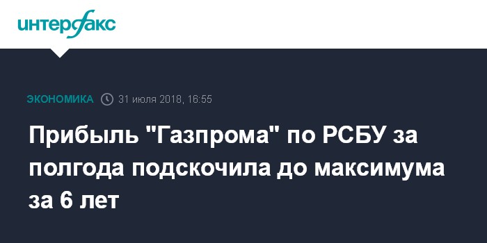 Москва. 31 июля. INTERFAX.RU - Чистая прибыль головной компании ПАО "Газпром" по российским стандартам (РСБУ) за первое полугодие 2018 года составила 284 млрд рублей, свидетельствуют расчеты "Интерфакса" на основе публичных данных компании.