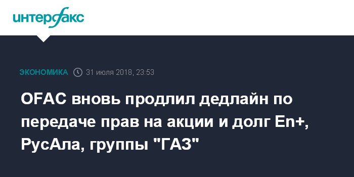 Москва. 31 июля. INTERFAX.RU - Подразделение Минфина США, отвечающее за правоприменение в области санкций (Office of Foreign Assets Control, OFAC), продлило до 23 октября 2018 года крайний срок, до истечения которого американские инвесторы должны передать права на акции и долговые обязательства компаний Олега Дерипаски - En+ Group, "РусАла" и группы "ГАЗ".