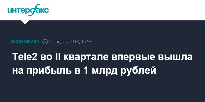 Москва. 1 августа. INTERFAX.RU - Чистая прибыль ООО "Т2 РТК Холдинг" (бренд Tele2) во II квартале 2018 года составила 1 млрд рублей, говорится в сообщении компании.