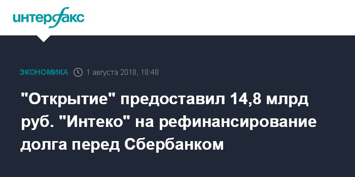 О рефинансировании "Открытием" части задолженности "Интеко" перед Сбербанком ранее в среду сообщил зампред ЦБ РФ Василий Поздышев. "Больший объем (задолженности - прим. ИФ) был в Сбербанке. Там "Открытие" сейчас забирает часть задолженности", - сказал зампред ЦБ журналистам. При этом он не назвал точную сумму, которую реструктурирует "Открытие".