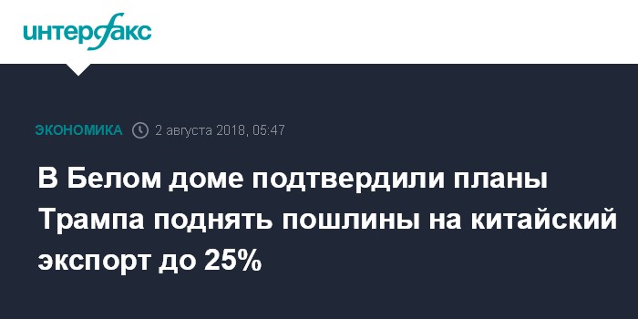 Москва. 2 августа. INTERFAX.RU - Президент США Дональд Трамп рассматривает вопрос о повышении ввозной пошлины на китайские товары стоимостью $200 млрд не на 10%, о чем он говорил ранее, а на 25%, сообщил торговый представитель США Роберт Лайтхайзер.