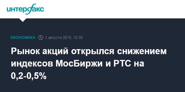 Москва. 2 августа. INTERFAX.RU - Рынок акций РФ открылся в четверг снижением цен большинства "голубых фишек" на фоне негативных сигналов, поступающих с мировых рынков капитала, из-за возросших рисков разрастания торговой войны между США и Китаем; индексы МосБиржи и РТС потеряли за минуту торгов 0,2-0,5%.