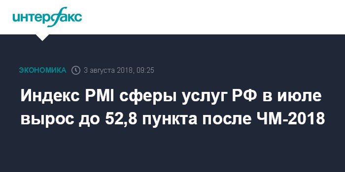 Москва. 3 августа. INTERFAX.RU - Индекс PMI сферы услуг России в июле 2018 года составил 52,8 пункта против 52,3 пункта в июне на фоне роста новых заказов и повышения деловой активности после завершения ЧМ-2018, свидетельствуют данные исследования IHS Markit.