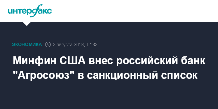 Пресс-релиз уточняет, что санкции замораживают все имущество и права на имущество банка "Агросоюз", которые находятся в юрисдикции США или американских граждан, а также запрещают американским гражданам вести какие-либо дела с этим банком.