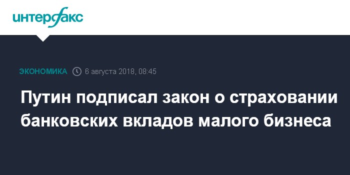 Москва. 6 августа. INTERFAX.RU - Президент РФ Владимир Путин подписал закон о распространении системы страхования вкладов в банках на предприятия малого бизнеса.