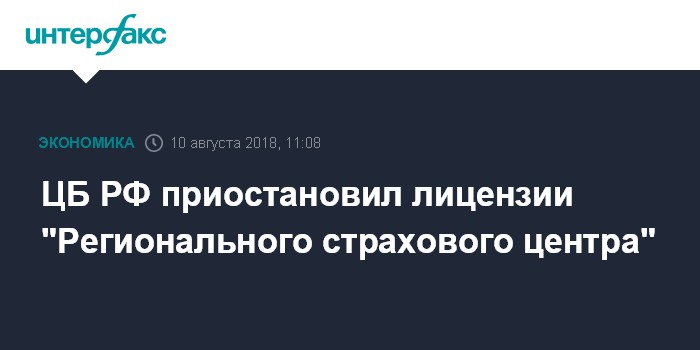 Москва. 10 августа. INTERFAX.RU - Банк России приостановил действие лицензий ООО "Региональный страховой центр" на осуществление добровольного личного и имущественного страхования, говорится в материалах регулятора.
