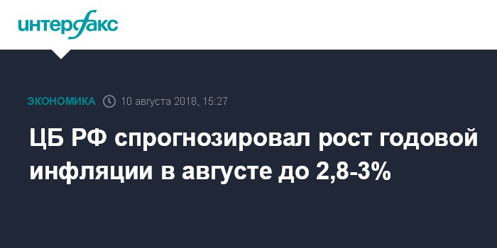 "По предварительной оценке, в августе темпы прироста потребительских цен составят 2,8-3%. К концу года инфляция ожидается в интервале 3,5-4%", - говорится в комментарии. ЦБ подтвердил ранее озвученный прогноз по повышению годовой инфляцией 4% в 2019 году в связи с повышением НДС.