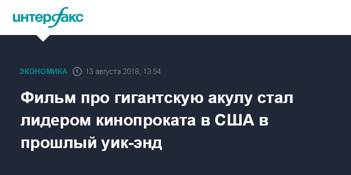 Москва. 13 августа. INTERFAX.RU - Фильм студии Warner Bros "Мэг: Монстр глубины" превзошел все ожидания экспертов по кассовым сборам в минувшие выходные и стал лидером кинопроката в США и Канаде, собрав $44,5 млн, сообщается на сайте BoxOfficeMojo.