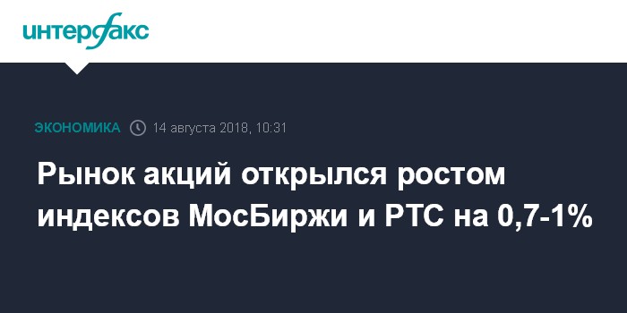 Москва. 14 августа. INTERFAX.RU - Рынок акций РФ открылся во вторник дальнейшим коррекционным ростом на фоне стабилизации мировых площадок после отката из-за кризиса в Турции, а также на фоне выросшей нефти; индексы МосБиржи и РТС за минуту торгов прибавили 0,7-1%, при этом локомотивом подъема выступают акции Сбербанка.