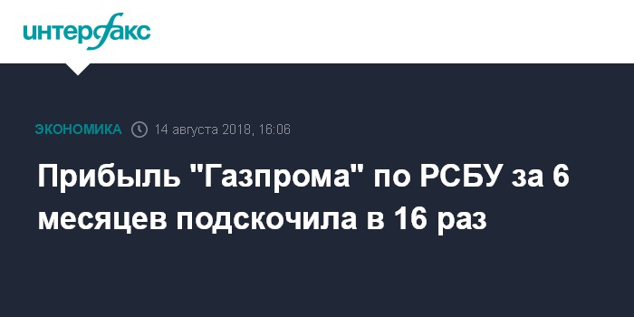 Москва. 14 августа. INTERFAX.RU - Чистая прибыль головной компании ПАО "Газпром" по российским стандартам (РСБУ) за первое полугодие 2018 года выросла в 16 раз по сравнению с аналогичным периодом 2017 года - до 284,093 млрд рублей, сообщается в ежеквартальном отчете компании.