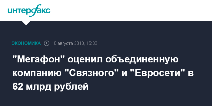 Москва. 16 августа. INTERFAX.RU - ПАО "Мегафон" обнародовало справедливую стоимость своей доли в объединенной компании "Связного" и "Евросети", исходя из которой общая оценка СП составляет примерно 62 млрд рублей.