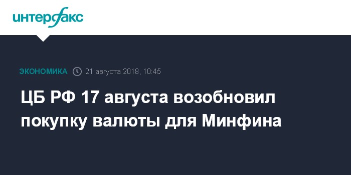 Москва. 21 августа. INTERFAX.RU - ЦБ РФ 17 августа возобновил покупку валюты для Минфина в рамках бюджетного правила, следует из данных Банка России.