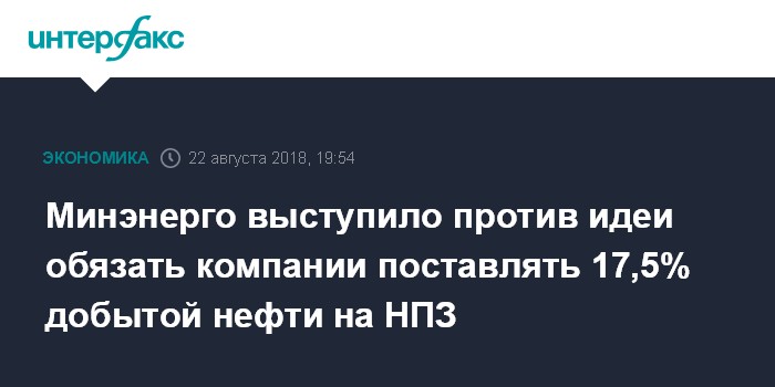 Москва. 22 августа. INTERFAX.RU - Минэнерго РФ посчитало нецелесообразной идею обязать нефтяные компании поставлять 17,5% добытой нефти на НПЗ, поскольку все крупные производители в настоящее время превышают данный показатель.